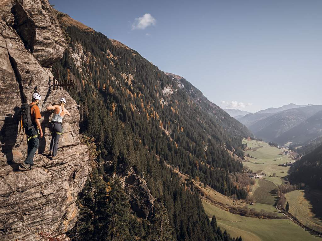 Nach der kurzen Fahrt vom Resort zur Talstation der Bergbahn Ratschings-Jaufen beginnt der Aufstieg – vorerst noch ganz bequem. Die 8er-Kabinenbahn schwebt über grüne Almwiesen und dichte Wälder hinauf zur Bergstation auf rund 2.000 Metern Höhe. Schon hier ist das Panorama beeindruckend, doch es ist nur der Vorgeschmack auf das, was folgt. Ein 15-minütiger Fußweg führt zum Einstieg des Klettersteigs, wo die Atmosphäre von alpiner Idylle zu konzentrierter Anspannung wechselt. Die Ausrüstung wird angelegt, der Helm festgezogen und der Karabiner des Klettersteigsets ein letztes Mal überprüft, bevor der Fels ruft.